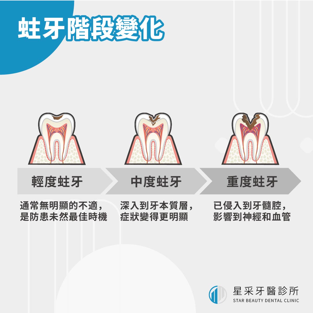 了解這個進程對於及時發現和處理蛀牙至關重要。我們的目標是在蛀牙還處於輕度階段時就著手治療,避免它演變成更嚴重的問題。