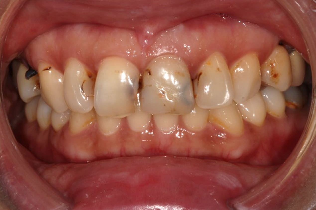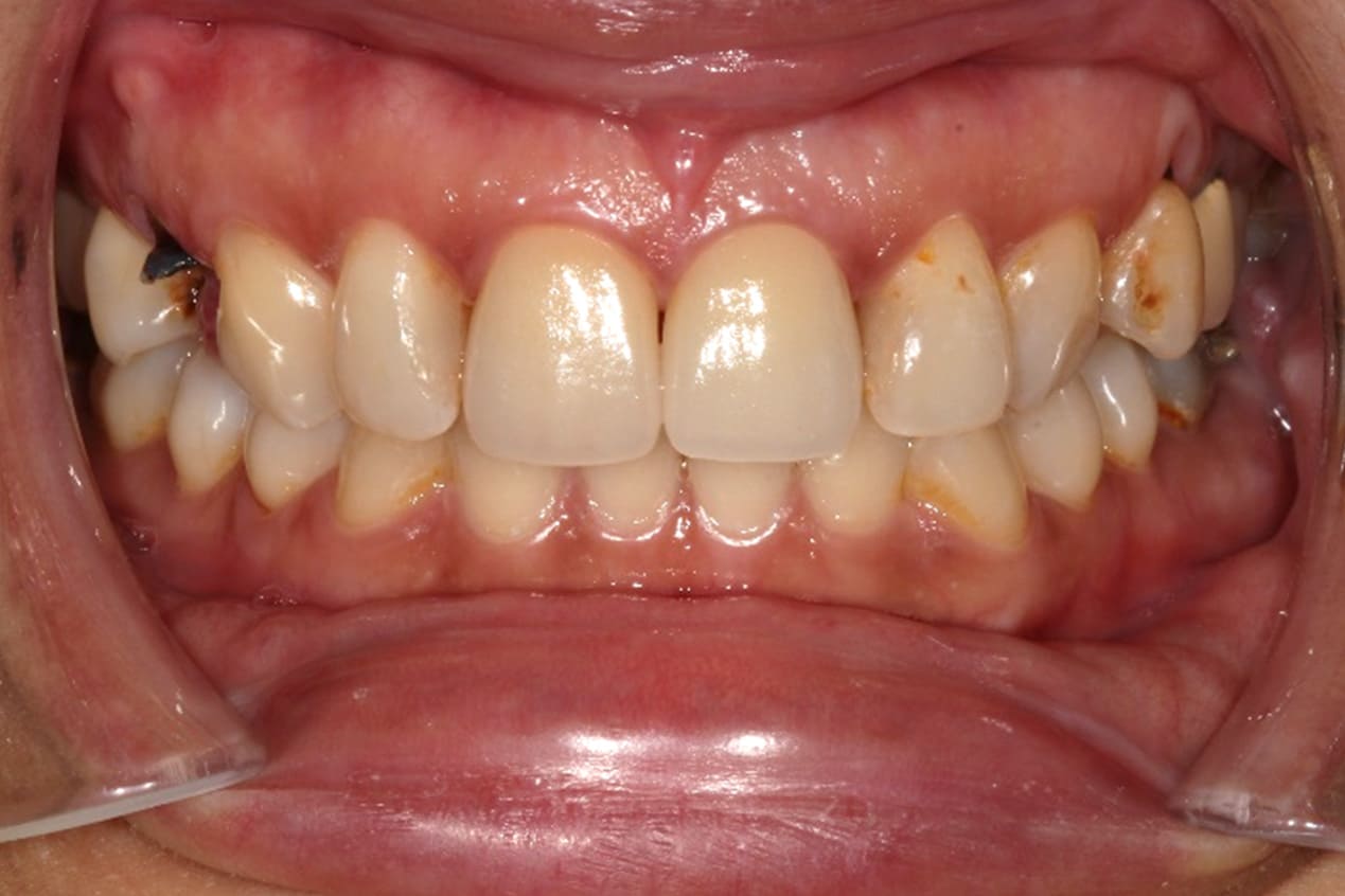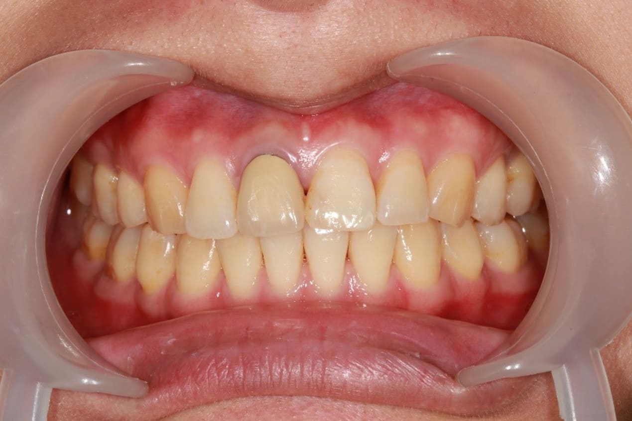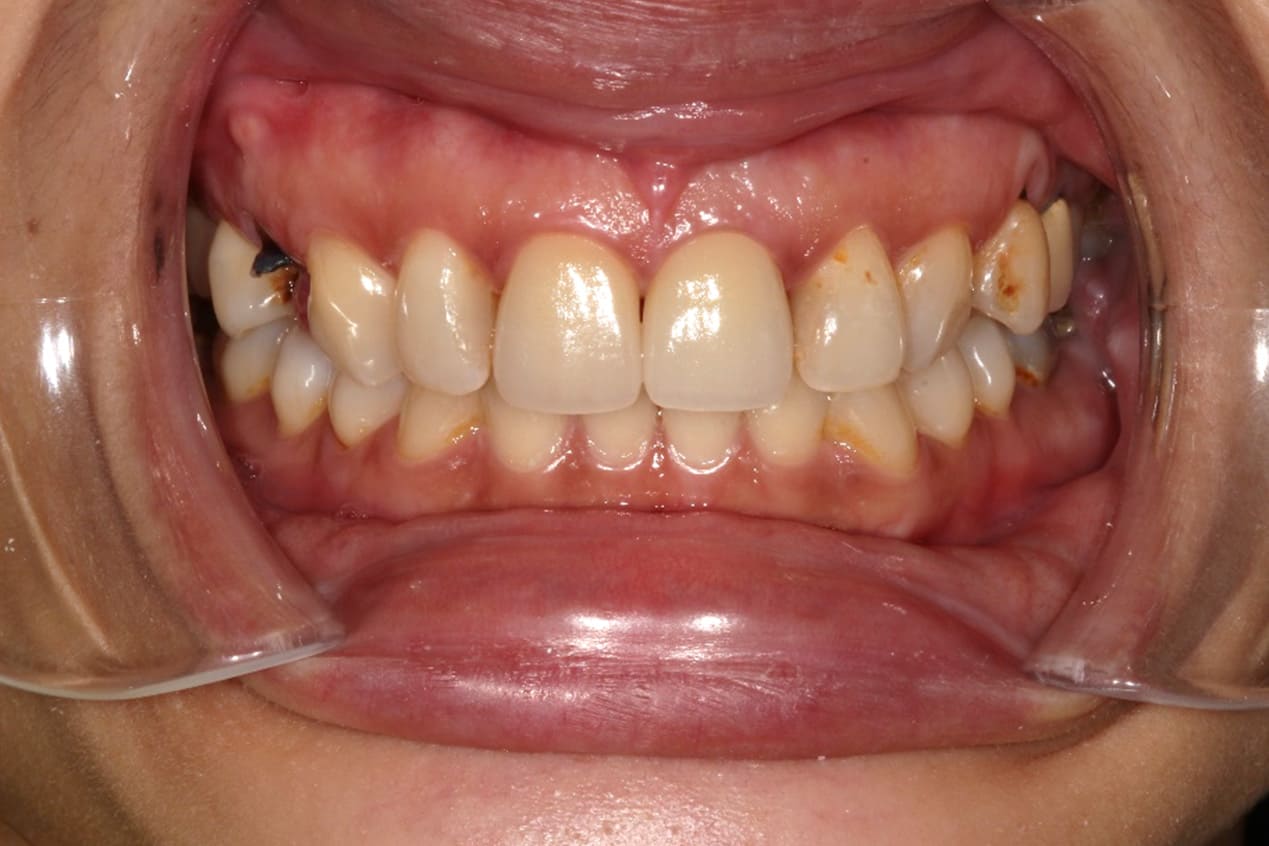 門牙金屬燒瓷牙,邊緣透出金屬色