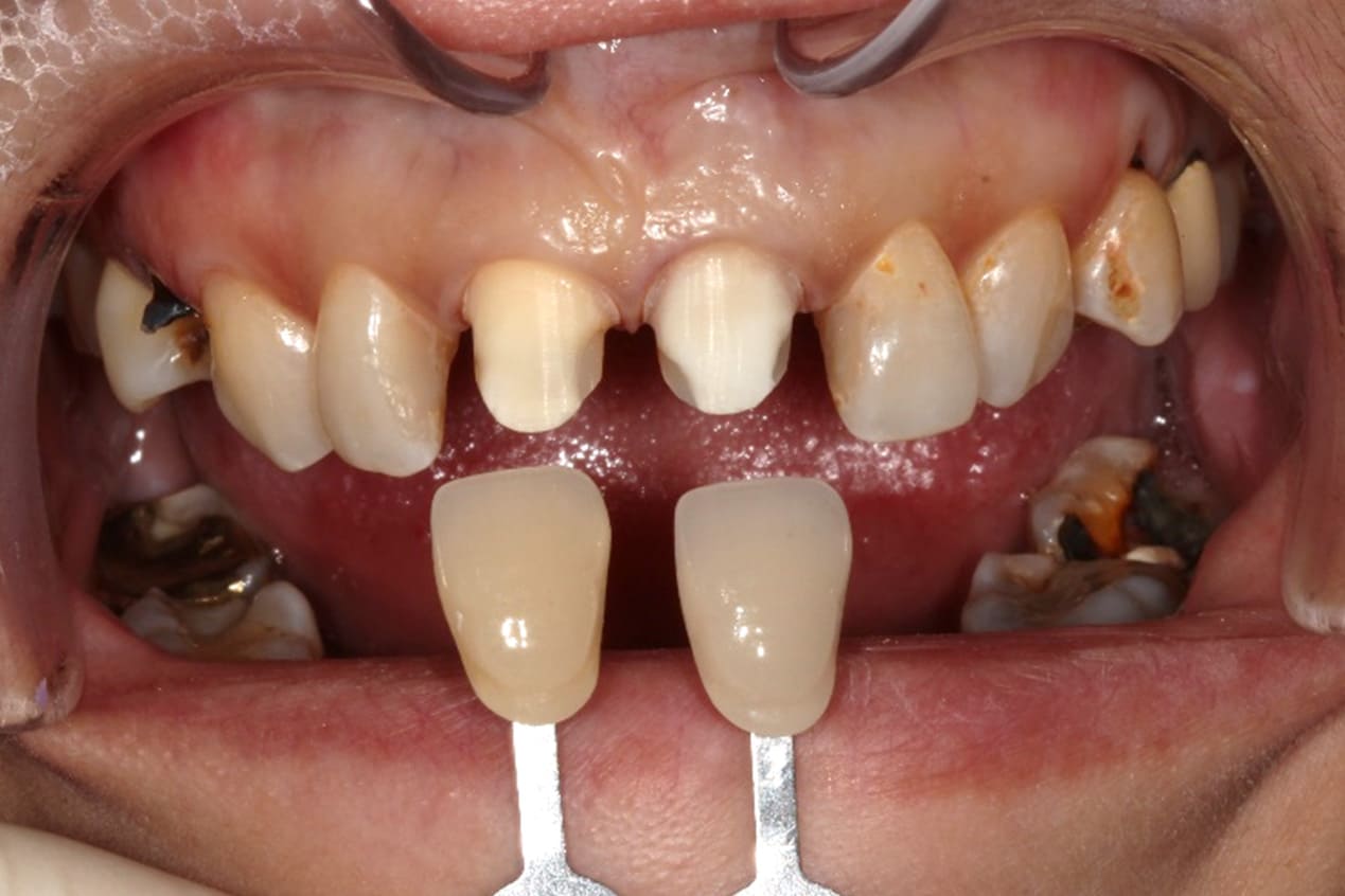 患者門牙嚴重齲齒,經根管治療並修型後,以全瓷牙冠復型