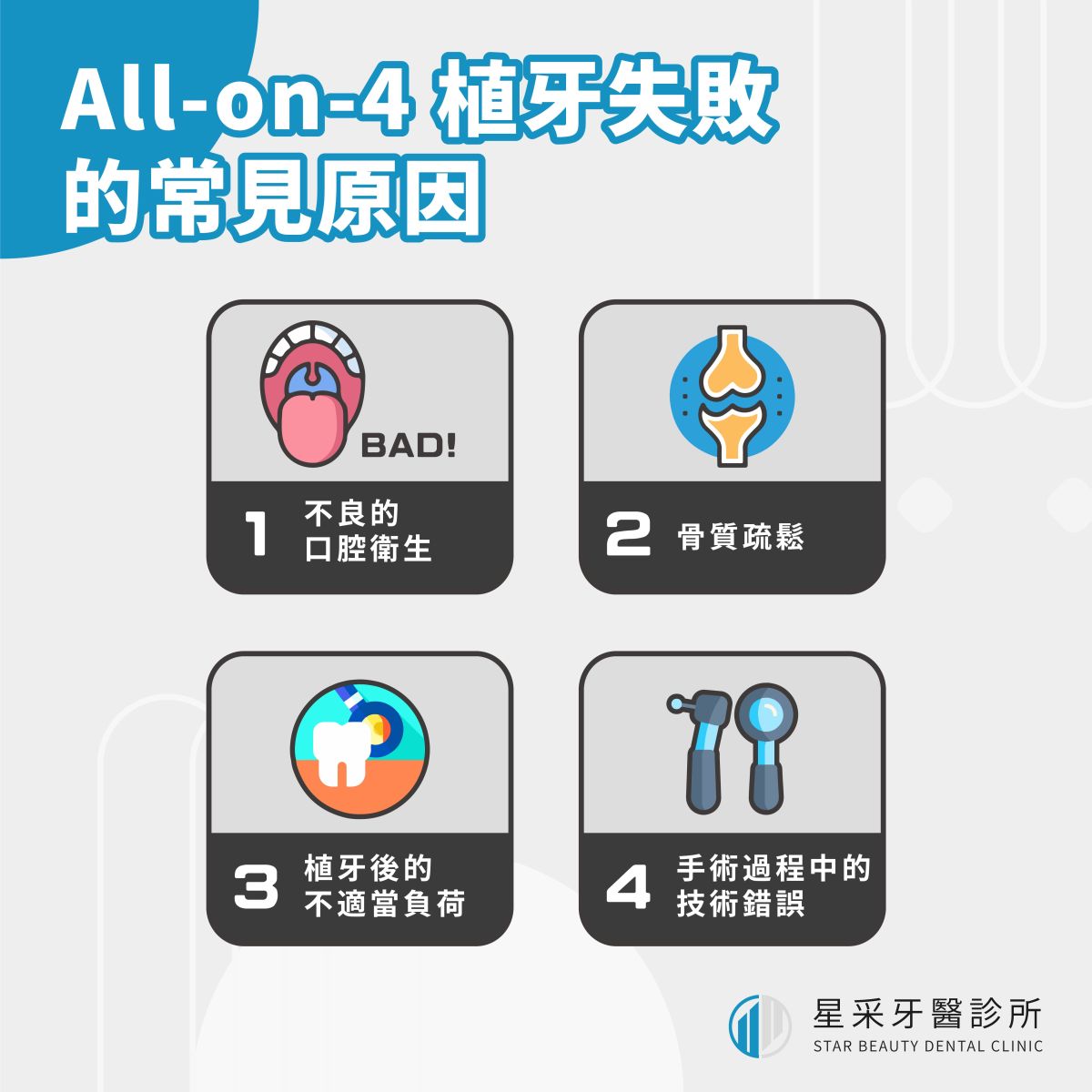 All-on-4植牙可以為患者帶來牙齒功能和美觀的改善,但手術難免都會有風險,了解All-on-4植牙、常見失敗原因,如骨質不足、手術規劃不當、植牙後期護理不到位等,並選擇經驗豐富的專科醫師,可以提高All-on-4植牙手術的成功率和患者的滿意度。